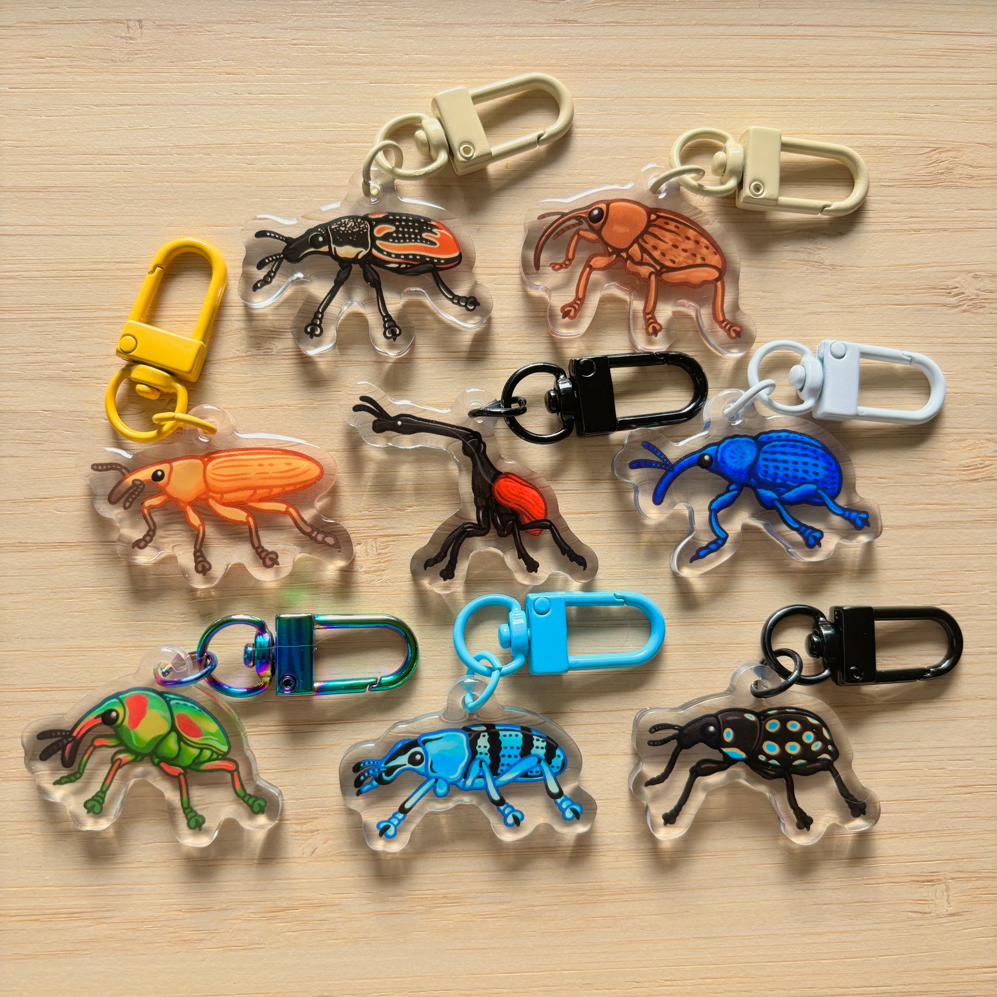 This set contains 8 mini acrylic weevil keychain designs!